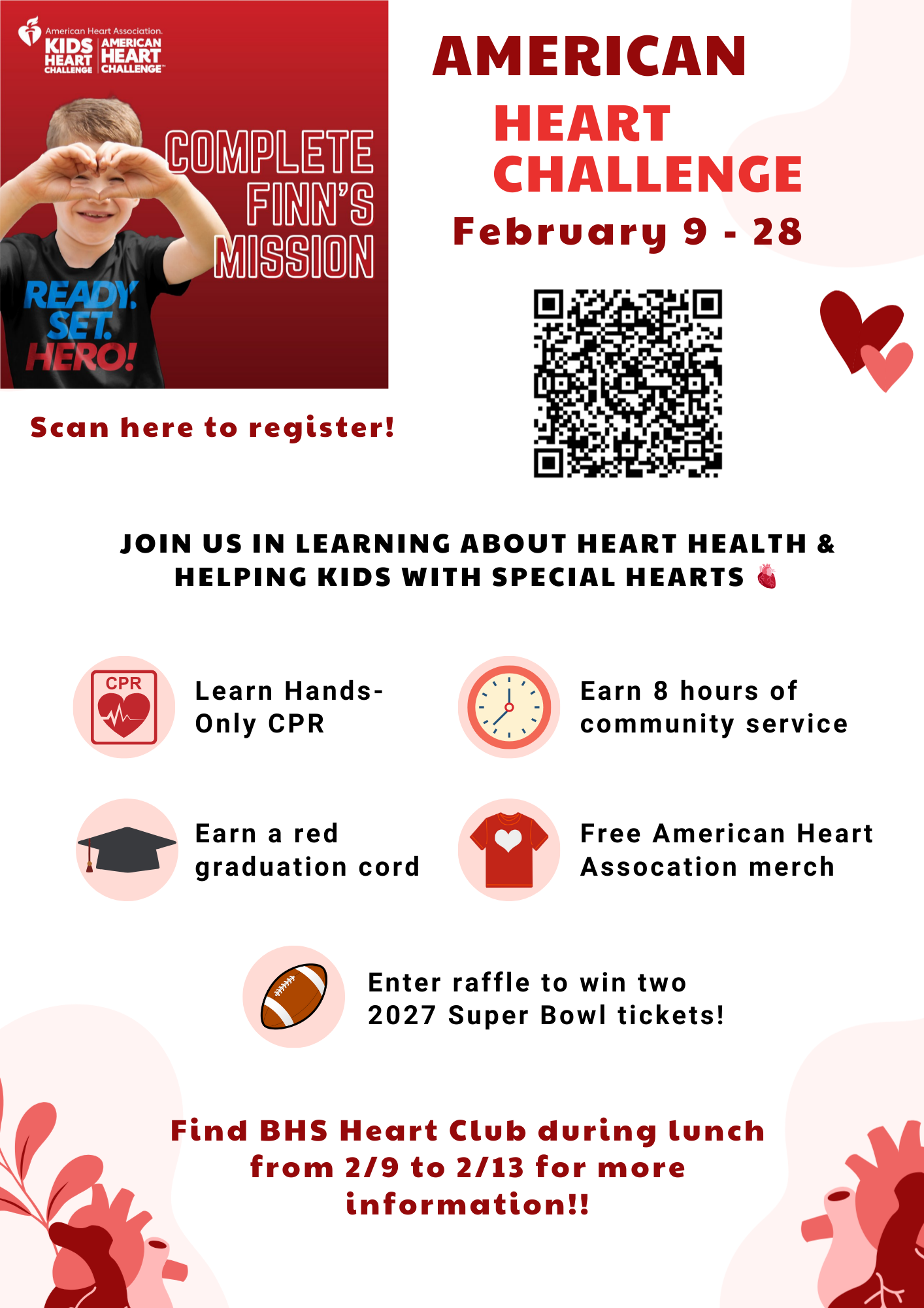 Heart Club is excited to honor American Heart Month by hosting the American Heart Association's American Heart Challenge! Students can scan the QR code to register until the end of February. Completing Finn’s Mission to learn Hands-Only CPR will earn students 8 hours of community service, a red graduation cord, and a raffle entry to win two 2027 Super Bowl tickets through the AHA's partnership with the NFL. Find us during lunch from 2/9 to 2/13 to register and make a difference in the fight against heart disease and stroke!