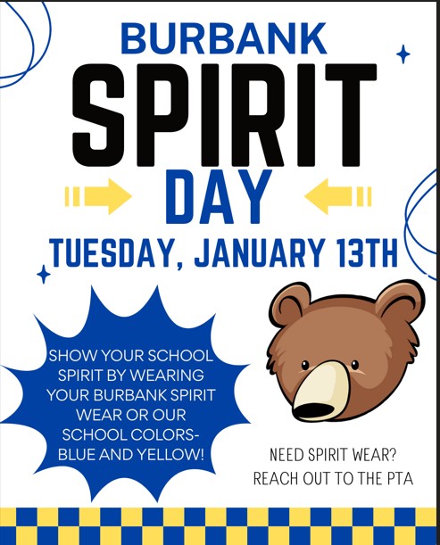 This Tuesday, January 13th, is a Burbank Spirit Day when students and staff are encouraged to wear the Burbank Spirit Wear or the colors blue, white and/or gold. It will be fun to celebrate our school spirit during our All School Meeting! |