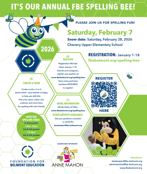 The FBE Spelling Bee will be February 7th this year at Chenery (snow date: February 28th). Please see this link for more information. Registration closes January 18th. |