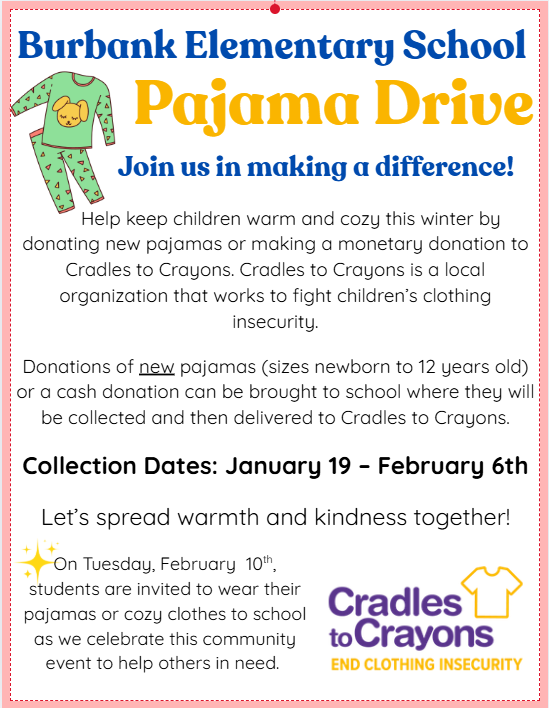 On Tuesday, February 10, students are encouraged to wear their pajamas or cozy clothes to school as we come together to celebrate our efforts. During our All-School Burbank Community Meeting, we will gather and present our collected donations to support Cradles to Crayons.